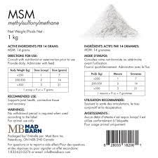 MSM is an equine supplement used to promote joint comfort, healthy connective tissue and recovery from exercise. It has been shown to relieve arthritic pain and sore muscles, protect against oxidative stress and support healthy skin, coats and hooves in horses. Available in 1 and 5 kg sizes. A Mad Barn product. Packaging is not as shown in the photo